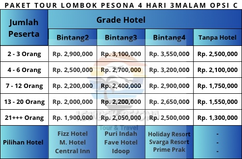 Detail Harga Paket Tour Lombok 4 Hari 3 Malam ( Opsi C ) Ini Sesuai Jumlah Peserta Dan Pilihan Hotel